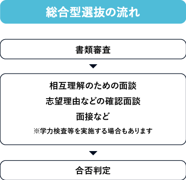 総合型選抜は、大学教育を受けるために必要な「知識‣技能」「思考力・判断力・表現力」を適切に評価するため、調査書等の出願書類だけでなく、各短期大学が実施する評価方法等(例:小論文、プレゼンテーション、口頭試問、実技、各教科・科目に係るテスト、資格・検定試験の成績、学習計画書等)、または「大学入学共通テスト」のうち、少なくともいずれか一つが課せられます。